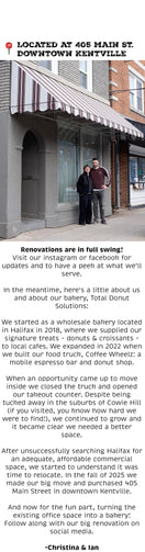 We have an ambitious renovation ahead of us in order to build our new bakery in Kentville. Any donations will offset the debt we take on with this project. Your contribution is truly appreciated. Thank you! Alternatively, you can purchase a gift card that will be honoured when we reopen - Christina & Ian